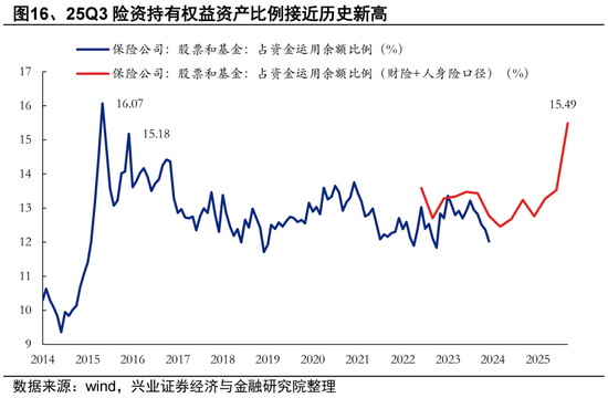 在推动中长期资金入市的政策方针下,险资在过去两年显著增持股票资产,并且在2025年流入进一步提速。一方面,保费收入有望维持高增,低利率叠加资产荒环境延续,系统性增配权益资产仍是大势所趋,另一方面,按照2025年初关于中长期资金入市建议“头部险企每年新增保费的30%用于投资A股”,险资在2025年增配股票进一步提速。截至2025Q3,险资持有权益资产比例大幅上升至15.5%,接近历史新高,其中持有股票占比升至10.0%,也已处于近年来的最高水平。