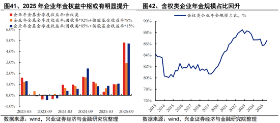 对于企业(职业)年金而言,同样在权益投资中枢提升与新增运作资金的双轮驱动下持续增配股票资产。过去三年,企业年金+职业年金每年新增运作资金7000亿元左右,2025年初中长期资金入市会议也强调了引导年金入市,叠加债券广谱利率下行,意味着这部分新增运作资金对于股票资产的配置比例更高。根据企业年金中的含权类与固收类产品收益率估算,含权类产品中股票资产比例从2024年8%的中枢上升至15%左右。尽管含权类产品中股票资产比例在2025年出现明显跃升,但是相比海外年金40%权益中枢仍有较高提升空间,因此企业/职业年金仍将在权益中枢提升与新增运作资金的双轮驱动下大幅增配股票资产。